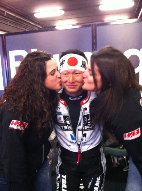 ピットで無事完走のご褒美にスペイン美女達からキスされて、何やら二ヤケ気味のレンです(#^.^#)